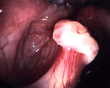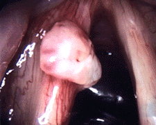 The diagrams below show an example of a T1 laryngeal cancer on the midportion of the left vocal fold. Both images were taken with a laryngeal telescope. The image to the right was taken with a 70 degree slope that looks at an angle of 70 degrees. In these photos the front of the neck is at the top, and the vocal folds form an upside down V. This tumor is sitting on the left true vocal fold.